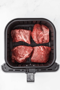 Place the seasoned flat iron steak in the air fryer basket in a single layer. Avoid overlapping or folding the meat, as this can cause uneven cooking.