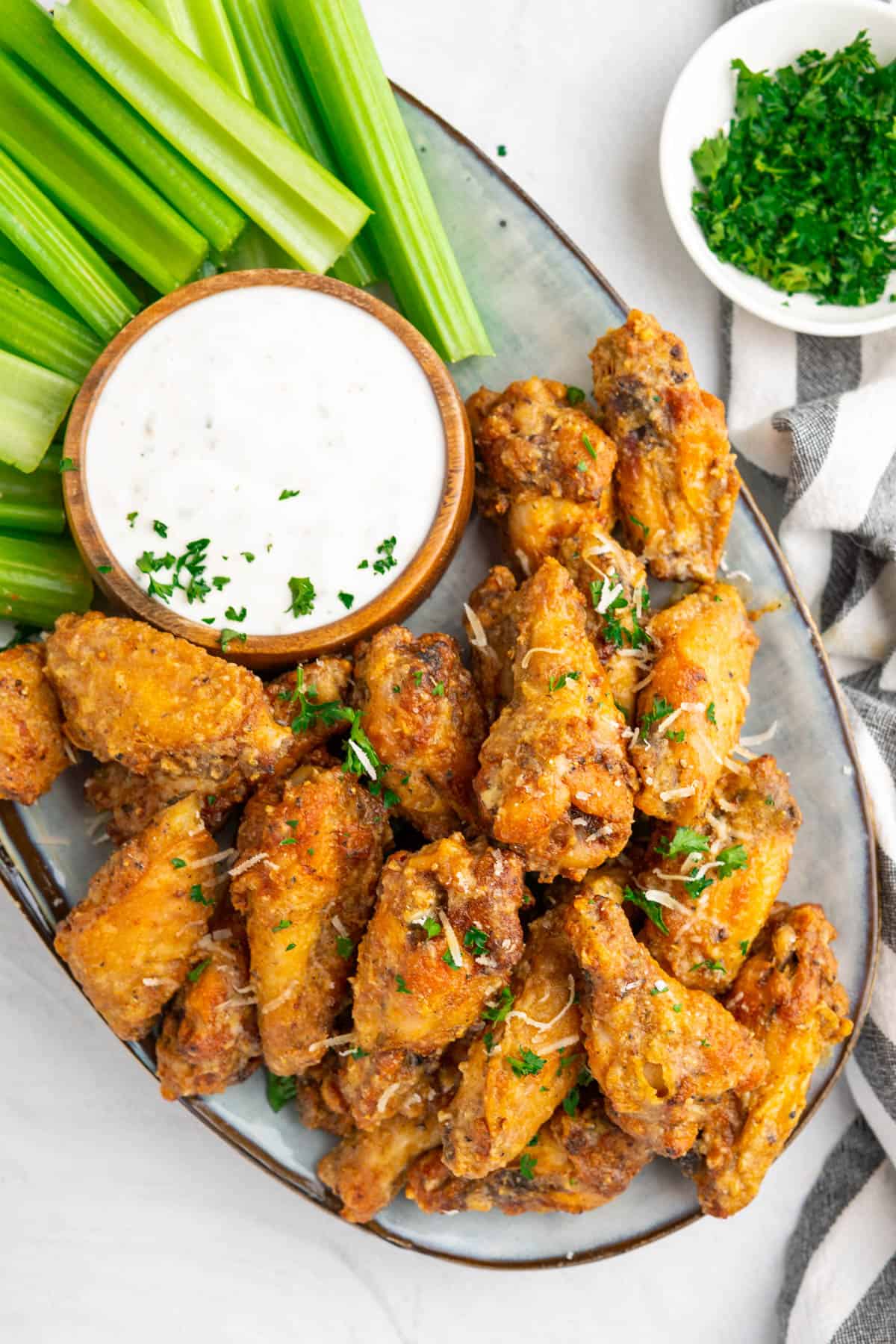Garnish the wings with fresh parsley and extra grated parmesan. Serve the garlic parmesan wings immediately with your favorite dipping sauce and sides.Fresh parsley, Grated parmesan