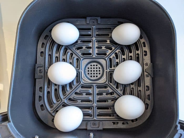 - Place 6-8 eggs into your air fryer basket, leaving space between them. Place the basket into the air fryer.