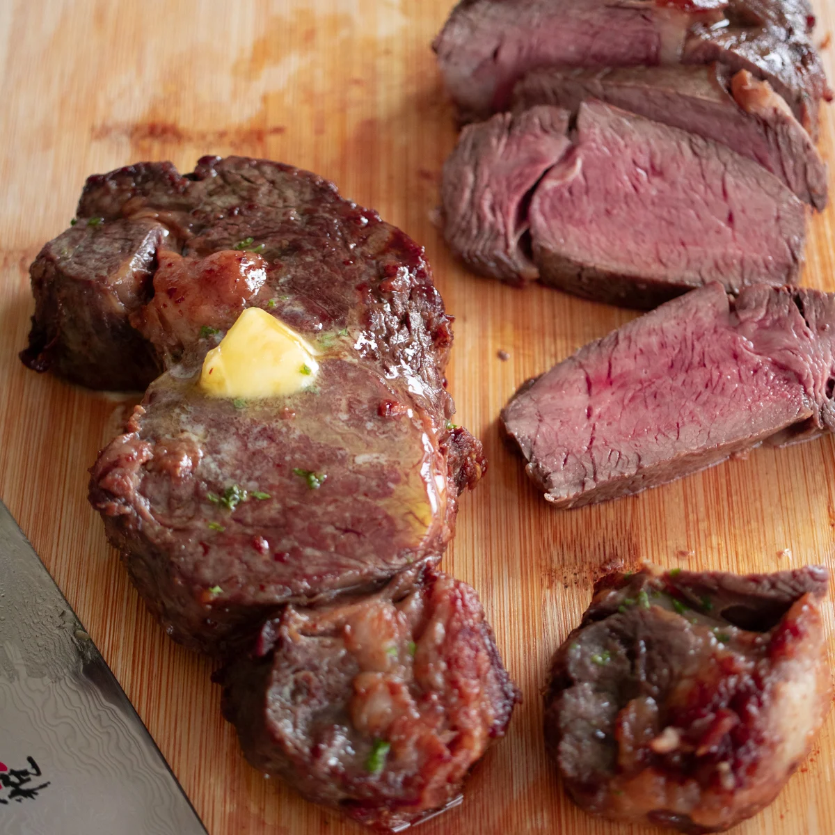 Top each steak with a generous dollop of garlic butter while it’s still warm — watch as it melts, glistening over the surface and seeping into the crevices.