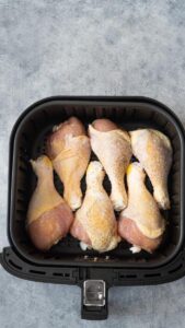 Place the drumsticks in the air fryer basket in a single layer. Avoid overcrowding; the hot air must circulate freely.