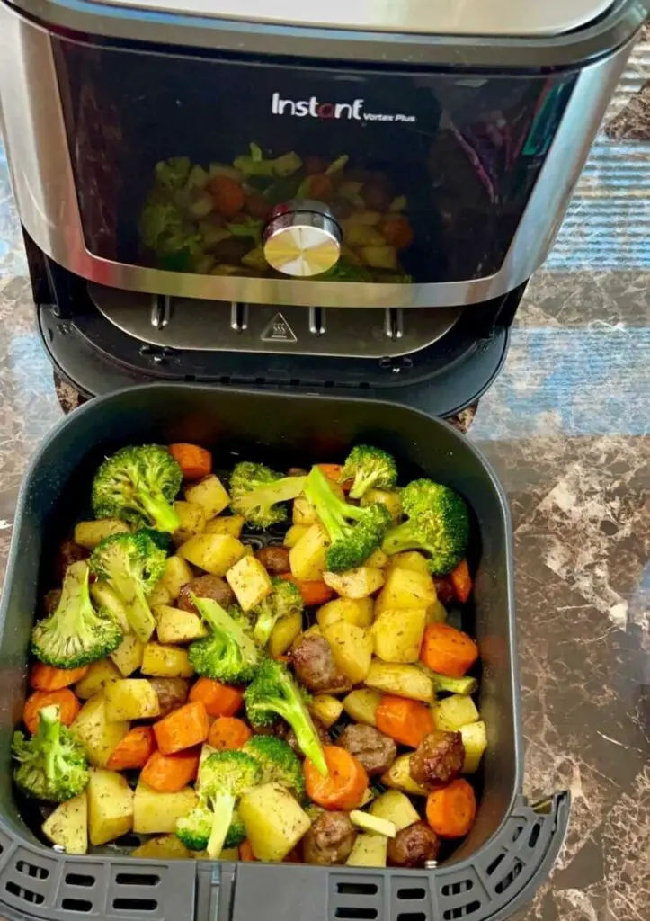• Pommes de terre et saucisses à la friteuse à air avec carottes et brocolis