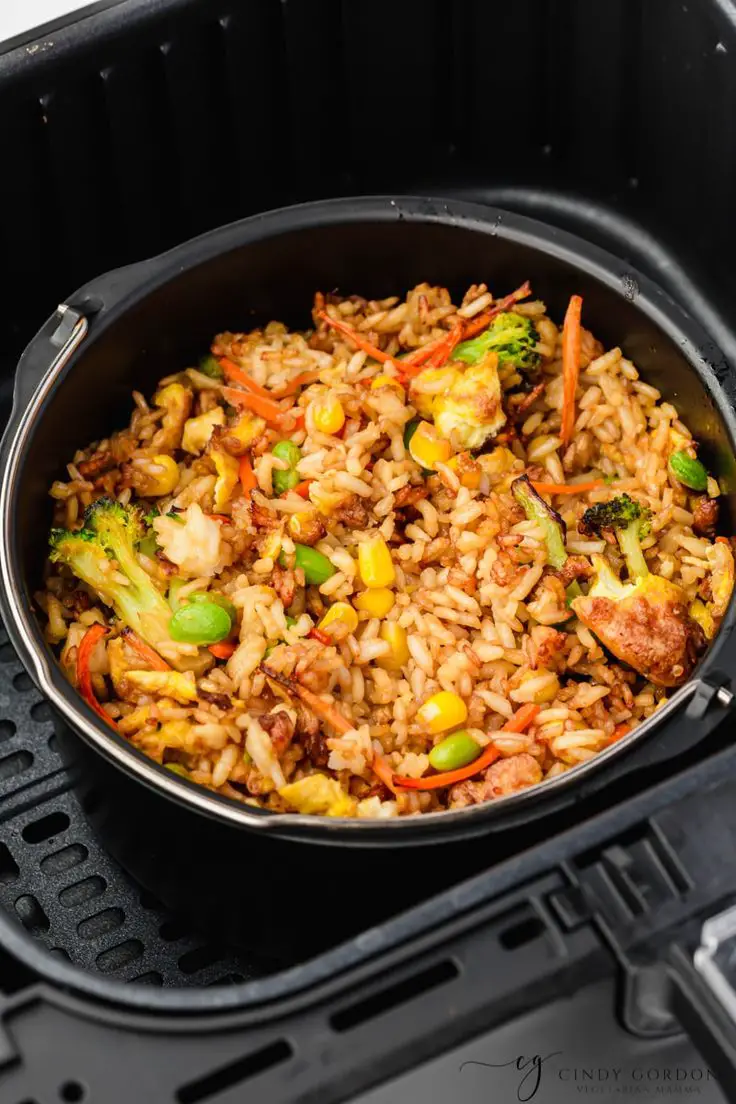 Replacez le tout dans l’Air Fryer (en plusieurs fois si besoin), et faites cuire à 190°C pendant 8 à 10 minutes, en mélangeant à mi-cuisson pour que le riz chauffe uniformément et que certaines zones deviennent légèrement croustillantes.
