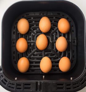 Place the eggs directly in the air fryer basket. Do not stack them. Leave a little space between each egg for even heat circulation.