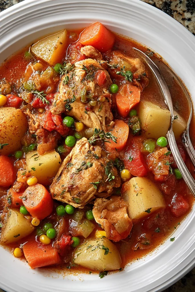 Rich, cozy, and brimming with wholesome ingredients, this slow cooker chicken stew is exactly the kind of dish that wraps you in a warm culinary hug from the very first spoonful. Tender chicken thighs, vibrant vegetables, and aromatic herbs come together in a symphony of flavors that develops slowly as it cooks, filling your kitchen with inviting warmth. Whether you’re coming in from a chilly winter day or just craving a comforting dinner that requires minimal effort, this recipe delivers a satisfying meal that feels both nourishing and indulgent. The combination of diced tomatoes, hearty potatoes, and a medley of peas and corn creates layers of texture and color, making each bite as visually appealing as it is delicious.