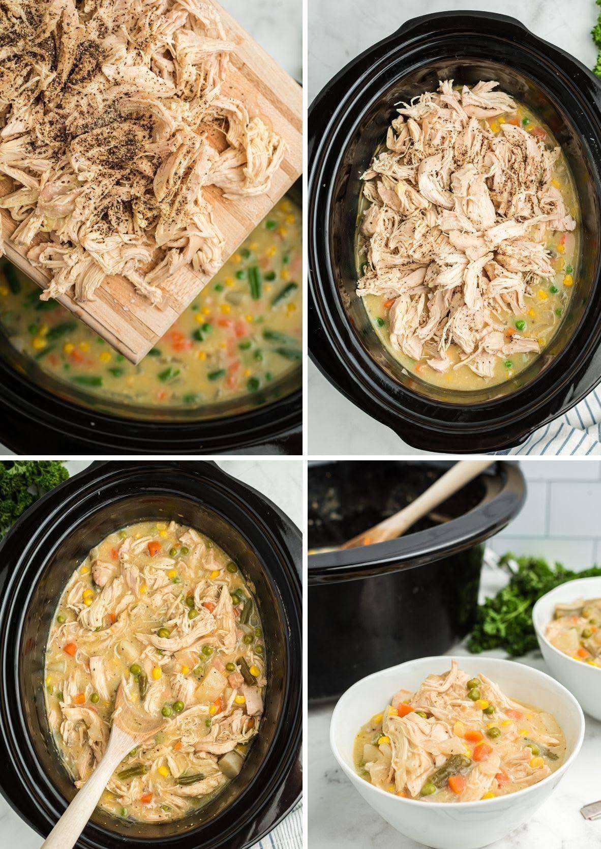 Yes. Cook the chicken and veggies in the slow cooker with 3 cups of chicken stock for 4-5 hours on high or 6-8 hours on low or until the chicken reaches an internal temperature of 165 degrees F. Shred the chicken and return it to the pot with 1/2 cup of heavy cream and a cornstarch slurry made of 1 tablespoon of cornstarch and 3 tablespoons of water. Cook for an additional 30 minutes on high or until it thickens to your liking.