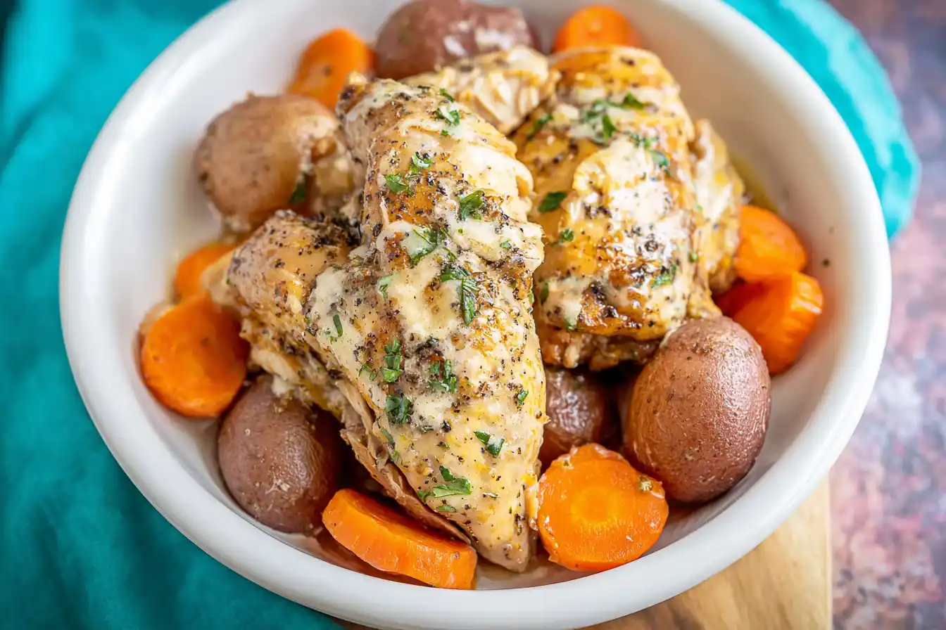 - Comfort in a bowl: Creamy ranch gravy coats tender chicken, carrots, and potatoes.