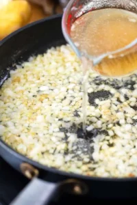 Deglaze and sauté: I pour the wine into the skillet and use a wooden spoon to scrape up all the browned bits from the bottom. Once that’s done, I pour the wine mixture into the slow cooker. Keeping the heat on medium, I melt the butter, add the garlic and onion, and sauté for one to two minutes until fragrant. Then I pour in one cup of broth to deglaze the pan again and get every last bit of flavor.