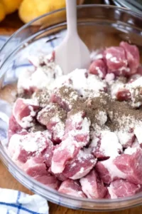Toss: First, I toss the pork in a large bowl with flour, salt, and pepper until each piece is nicely coated.